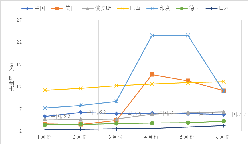 在新冠肺炎疫情陰云之下,全球勞動力市場持續(xù)收緊,目前仍未出現(xiàn)好轉(zhuǎn)跡象。國際勞工組織指出,2020年二季度全球工作時下降14%,相當(dāng)于減少了4億個全職工作崗位,勞動力市場下半年也難以恢復(fù)到疫情前水平。美國失業(yè)率從2月份的3.5%飆升到4月份的14.7%,創(chuàng)上世紀(jì)大蕭條以來最高值,6月份雖回調(diào)到11.1%,但仍處于罕見高位。2-6月份,主要國家失業(yè)率持續(xù)上升,俄羅斯由4.6%升至6.3%,印度由7.8%增至11%,其中4月份和5月份高達23.5%,預(yù)計巴西由11.6%增至13.1%、日本由2.4%增至3.2%、德國由3.5%增至4.2%。