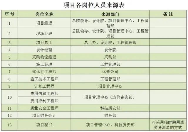 完成組織結(jié)構(gòu)設(shè)計(jì)后,需要為崗位配備人員,項(xiàng)目崗位職數(shù)根據(jù)項(xiàng)目等級(jí)進(jìn)行限額配置,總體原則為: